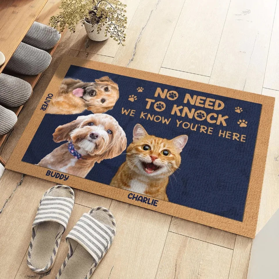 Custom Photo We Know You're Here - Dog & Cat Personalized Custom Home Decor Decorative Mat - House Warming Gift For Pet Owners, Pet Lovers