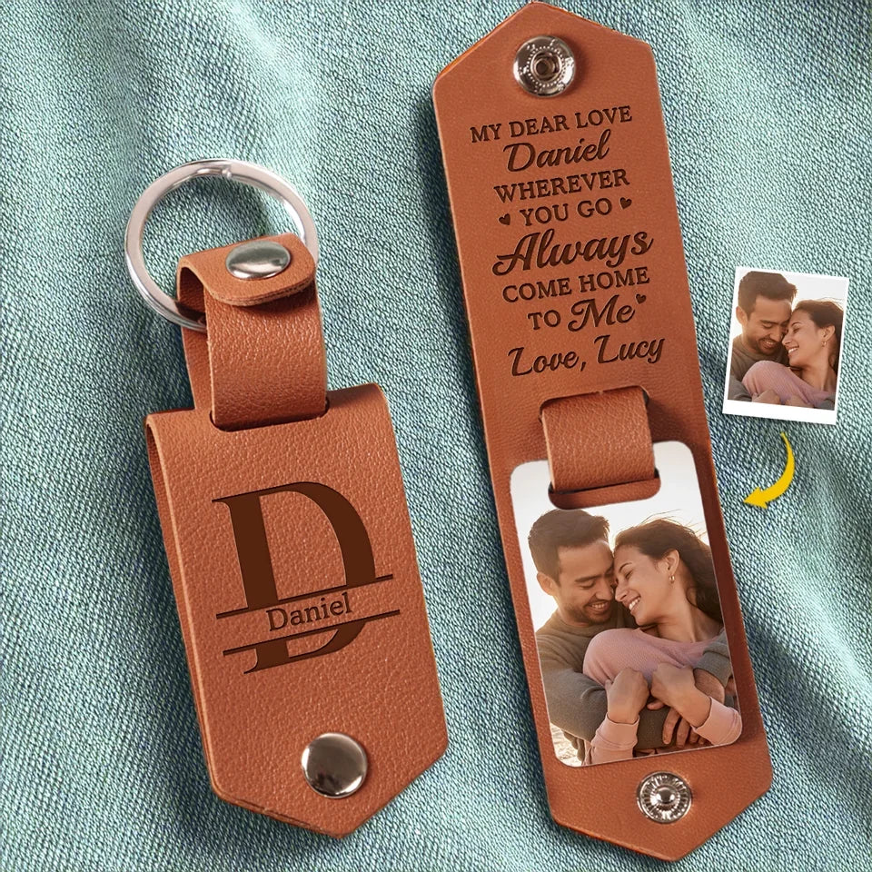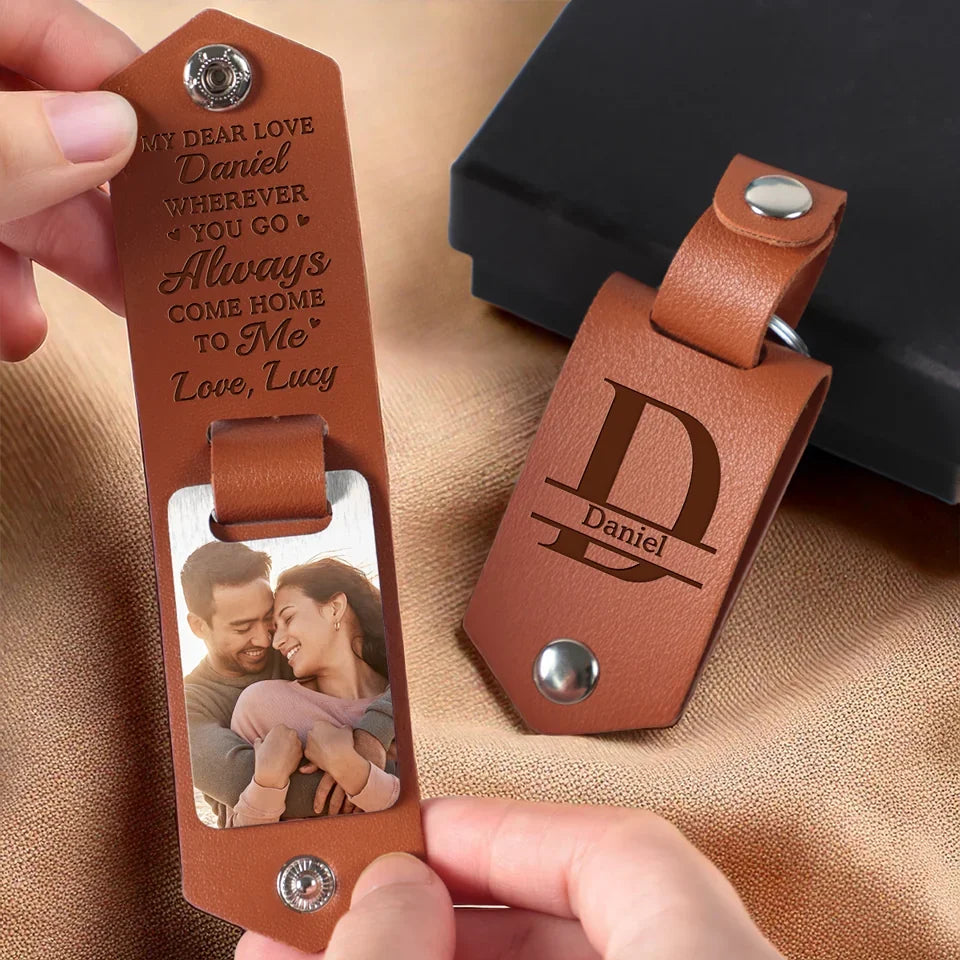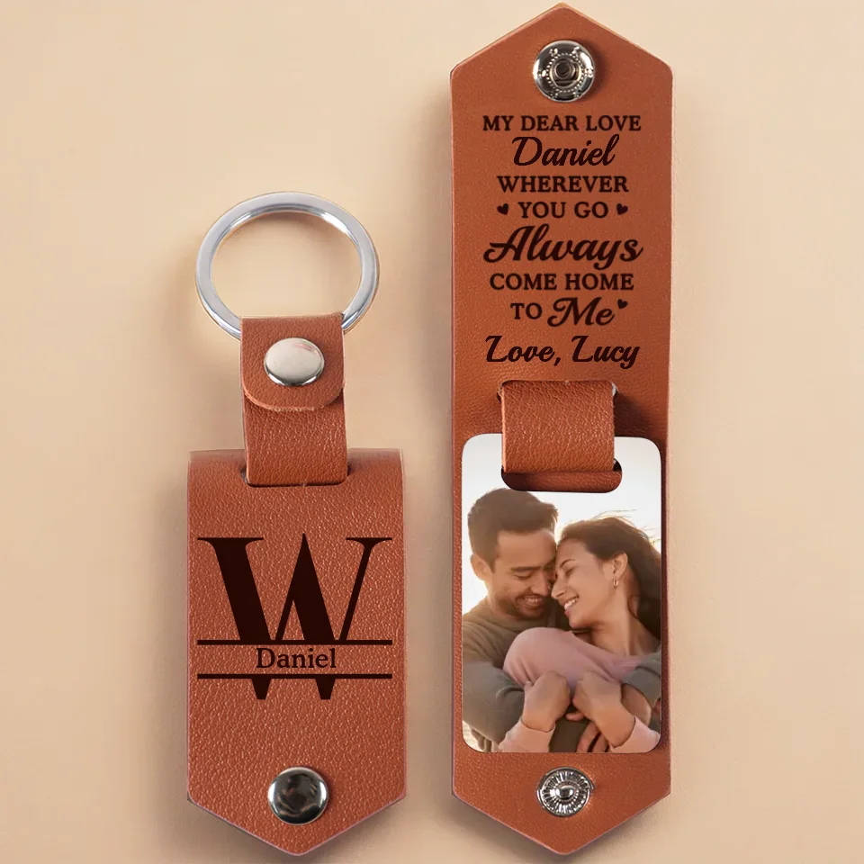 Custom Photo Wherever You Go, Always Come Home To Me - Couple Personalized Custom Engraved Leather Keychain - Gift For Husband Wife, Anniversary