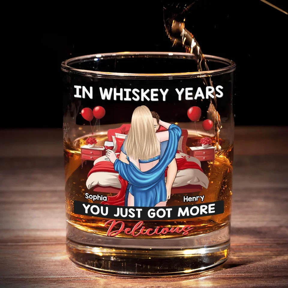 In Whiskey Years You Just Got More Delicious - Couple Personalized Custom Whiskey Glass - Gift For Husband Wife, Anniversary