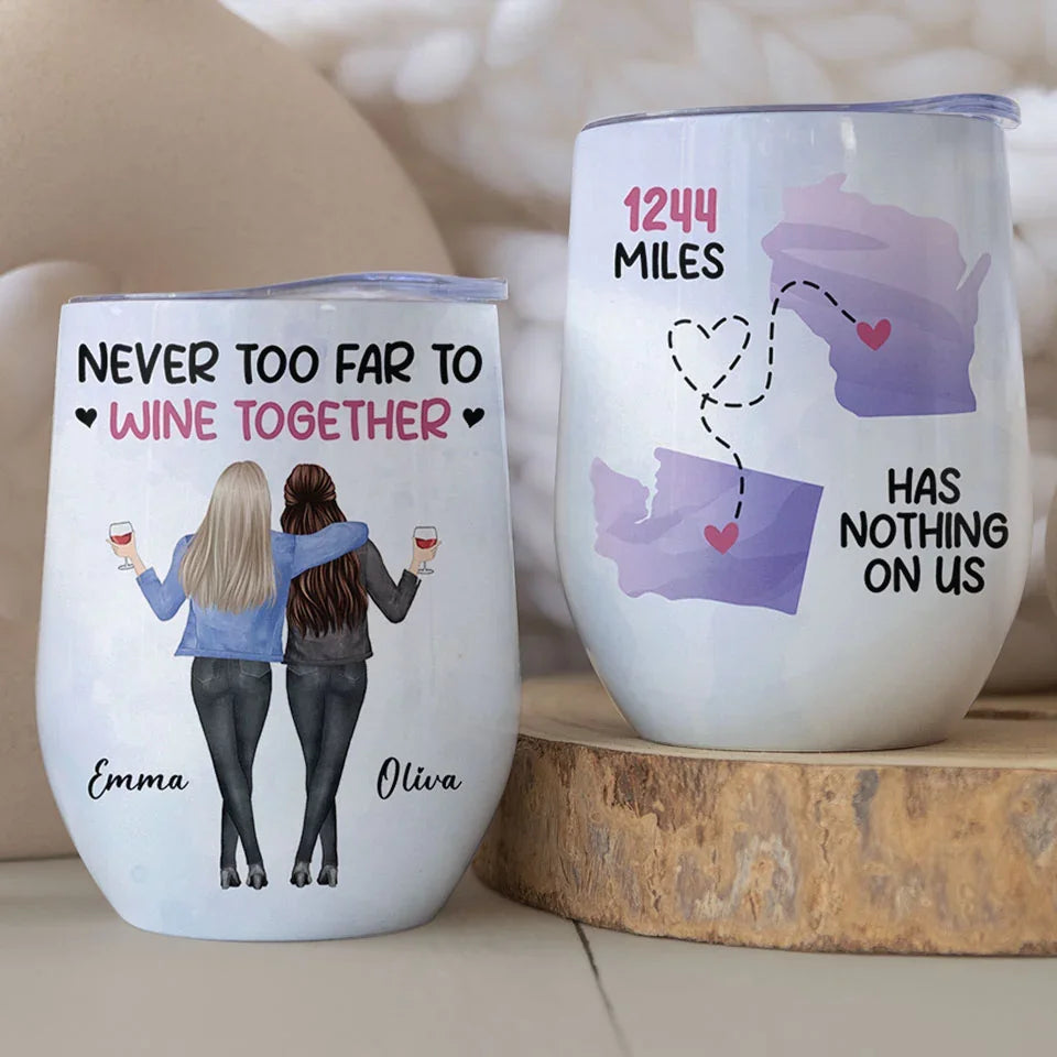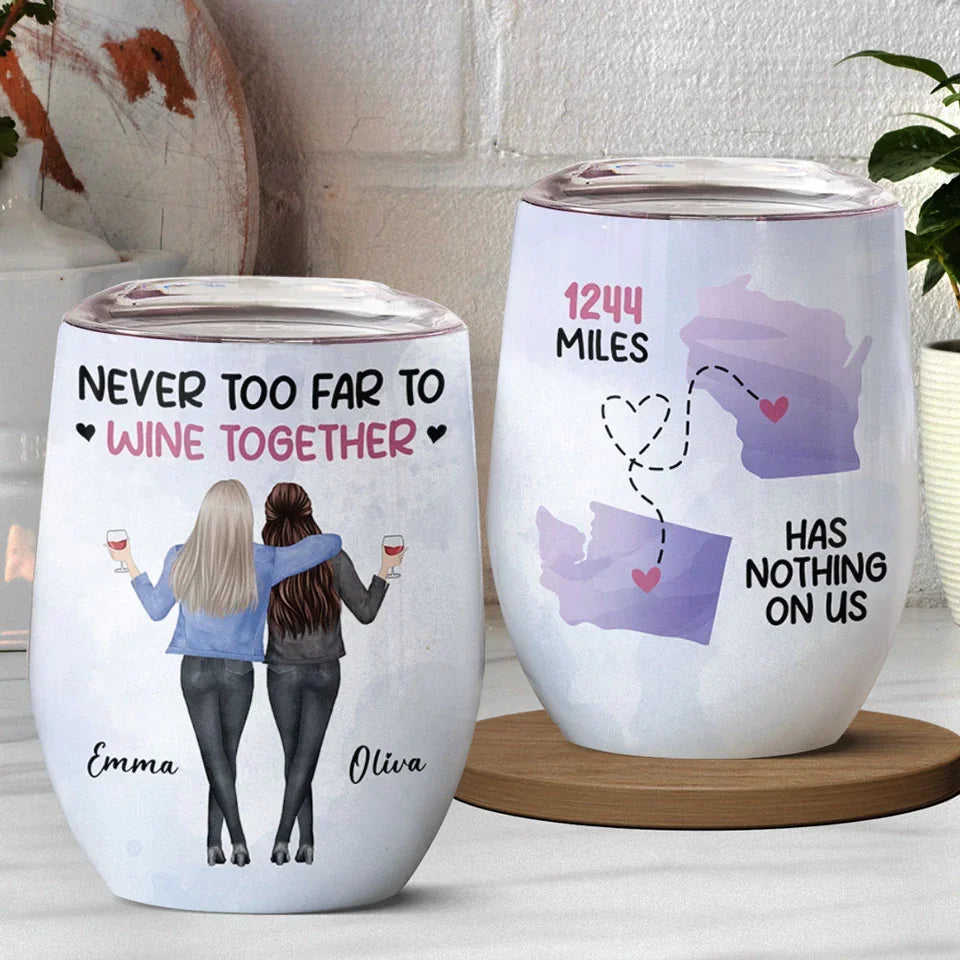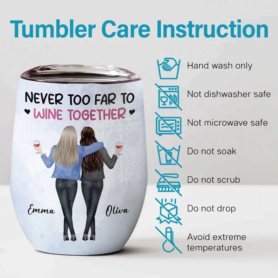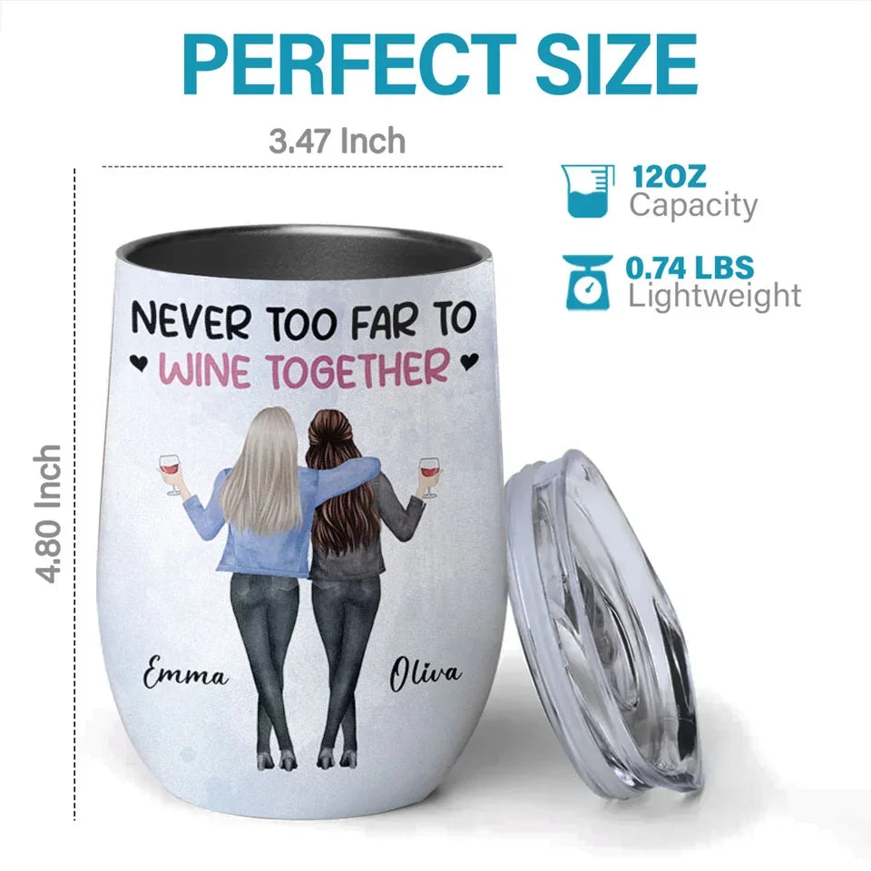 Never Too Far To Wine Together - Bestie Personalized Custom Wine Tumbler - Christmas Gift For Best Friends, BFF, Sisters
