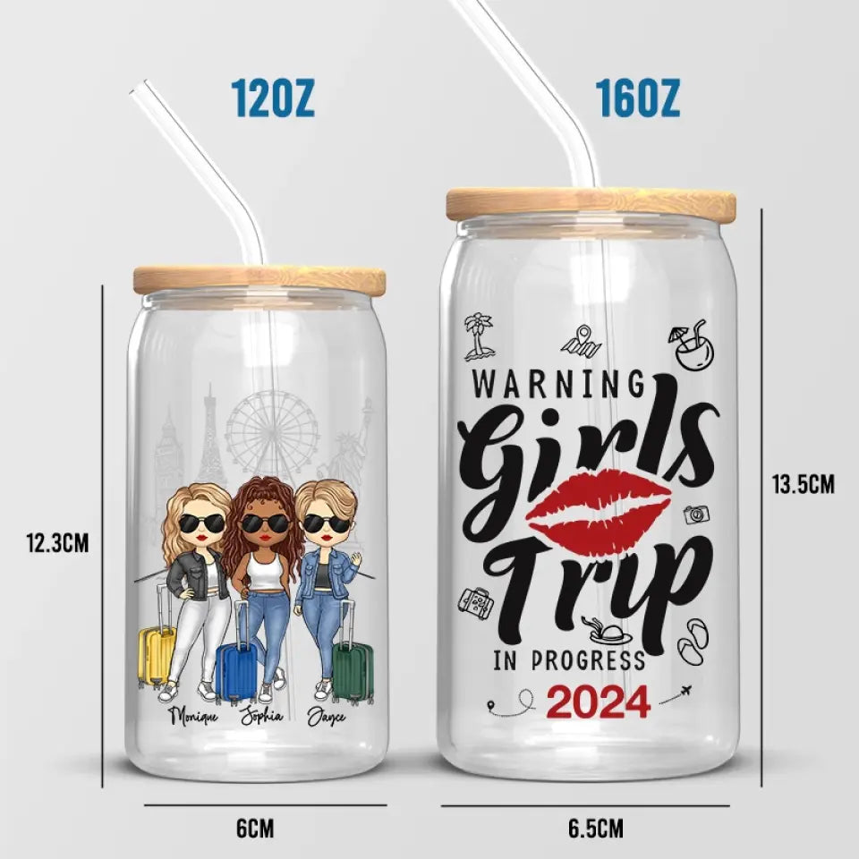 Warning! Girls Trip In Progress - Bestie Personalized Custom Glass Cup, Iced Coffee Cup - Summer Vacation Gift For Best Friends, BFF, Sisters