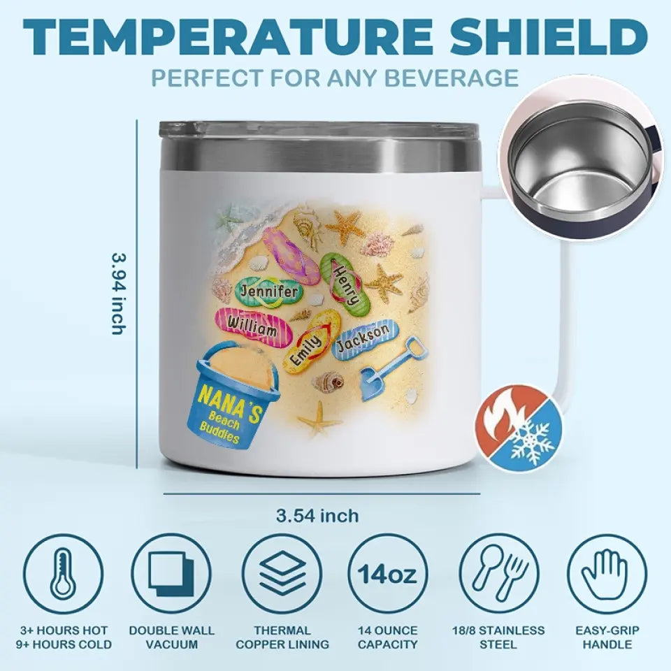 We Are Mom's Beach Buddies - Family Personalized Custom 14oz Stainless Steel Tumbler With Handle - Gift For Mom, Grandma