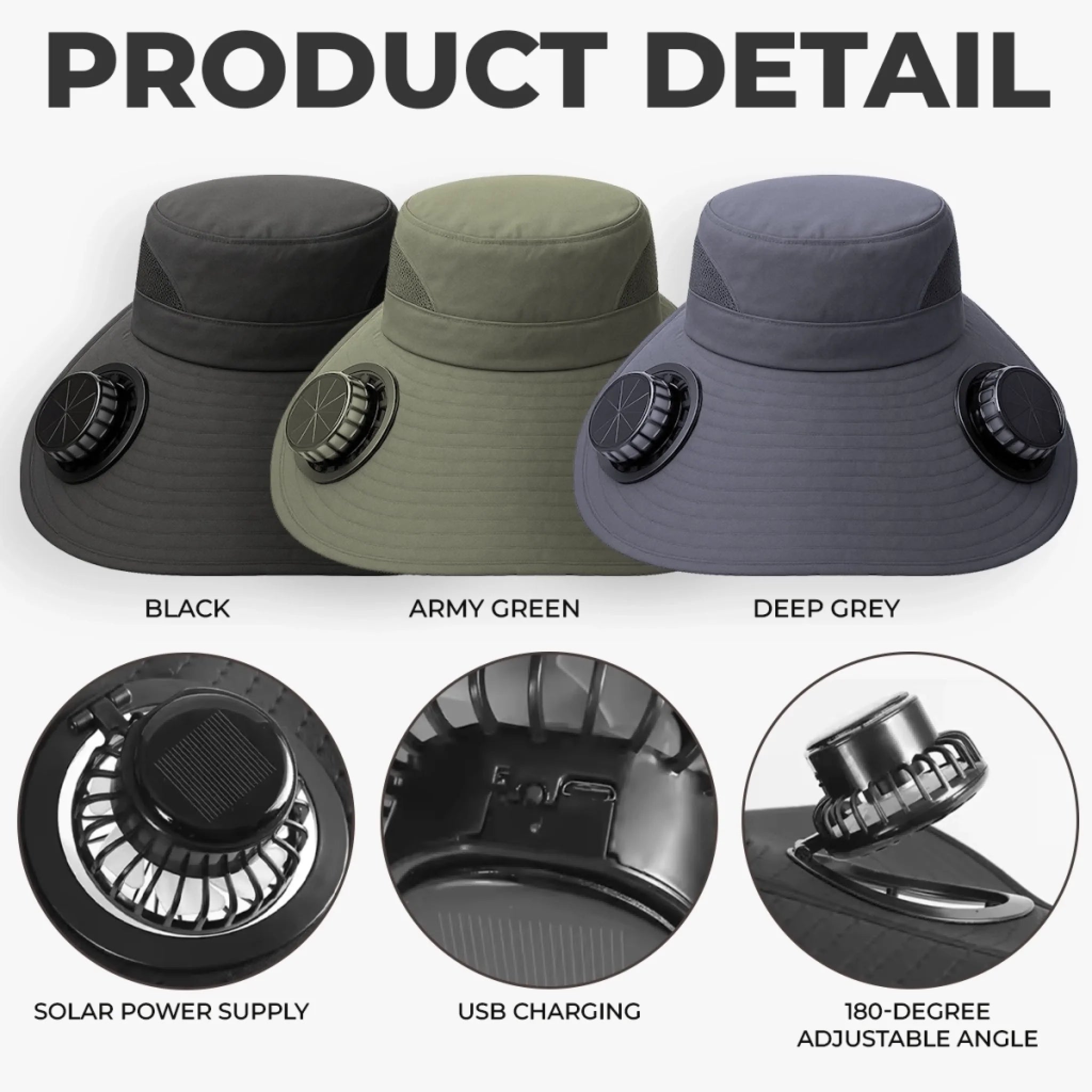 Dual cooling fans (solar-powered + USB) with 180° adjustable angle.