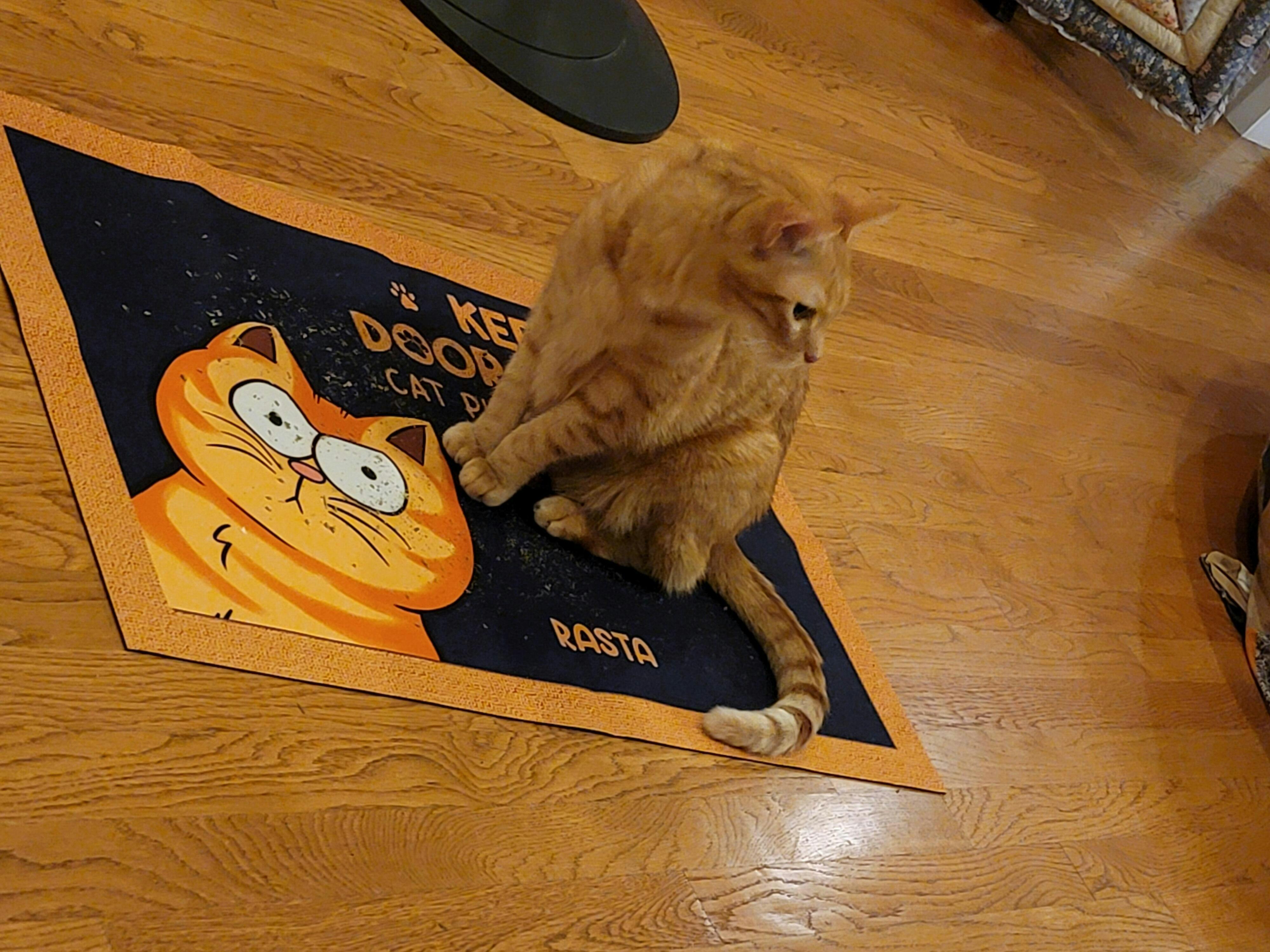 This is so cute. I loved the idea of it and when I received the mat it was very well done. Nice colors and just the thing I needed. My son's orange cat Rasta came to inspect it immediately. Sniffered the picture, his name everything n sat on it. Job well done !!